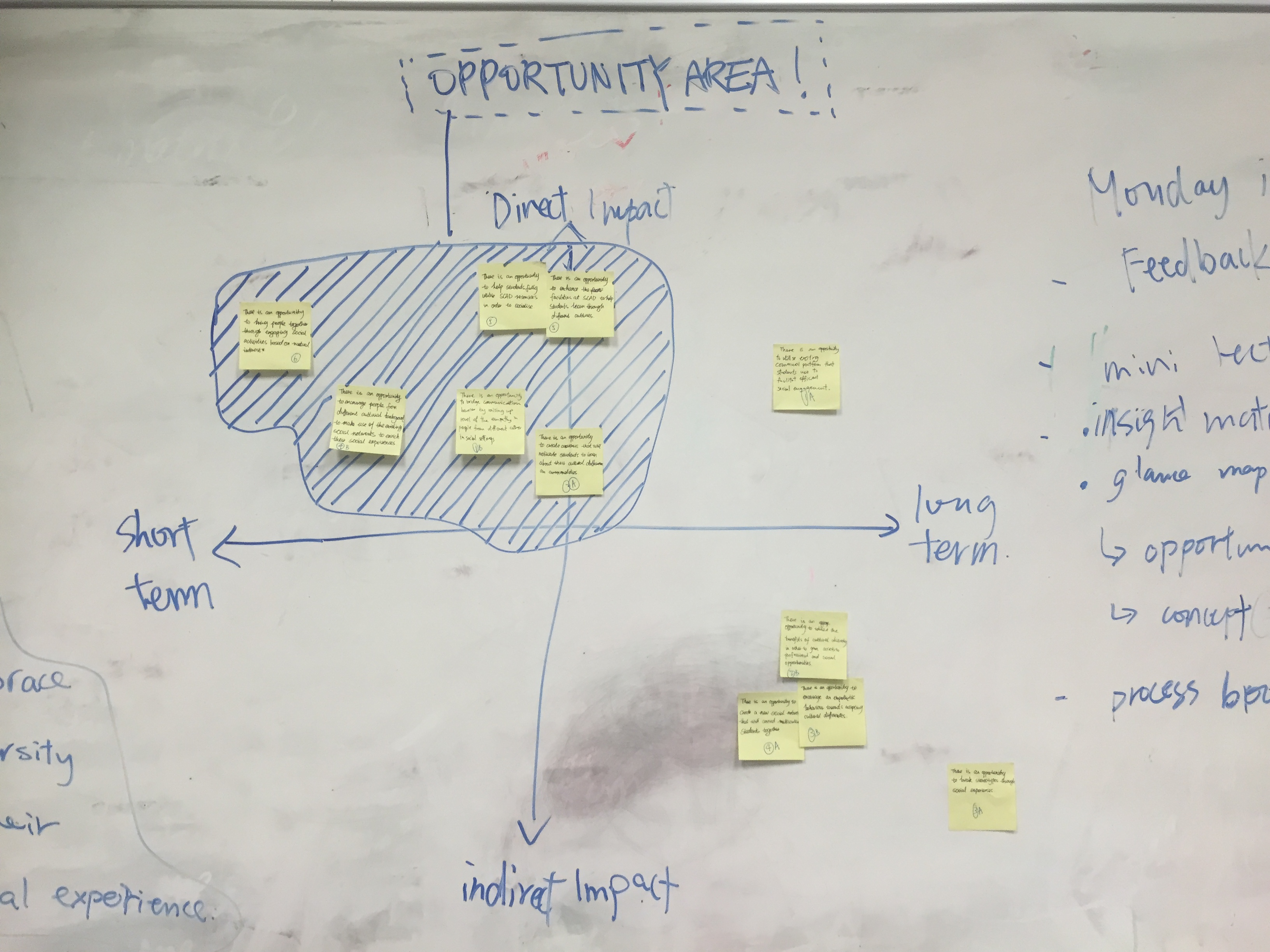 The many opportunities realized were refined by mapping short- and long-term impact and relevance to the original umbrella research question. The map below was created to visualize the impact of the opportunities upon intercultural students’ social experiences in terms of the value for each opportunity. Hence, the intercultural social experience was mapped at the core of the opportunity map and surrounded by eleven interrelating reciprocal opportunities. Social networks, communal activities and SCAD resources were identified as channels for exchanging intercultural experience that influence students’ attitudes, behaviors and learning. Enhanced learning and improved attitude enrich student experiences and influence students’ levels of awareness, empathy and personal and professional relationships. All the opportunities were found to be interlinked and reciprocal. It was identified that any of them would eventually leverage the rest. Therefore, opportunities were mapped on a 2x2 matrix as a next step in order to decide