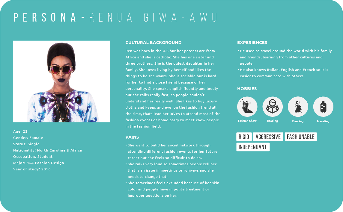 To define and represent the key stakeholders clearly, the design team created six different personas from the data findings: one from China, one from India, one from Germany, one from Colombia and two from the US. These six personas emerged from primary and secondary research findings based on positive and negative experiences when interacting with culturally diverse populations.